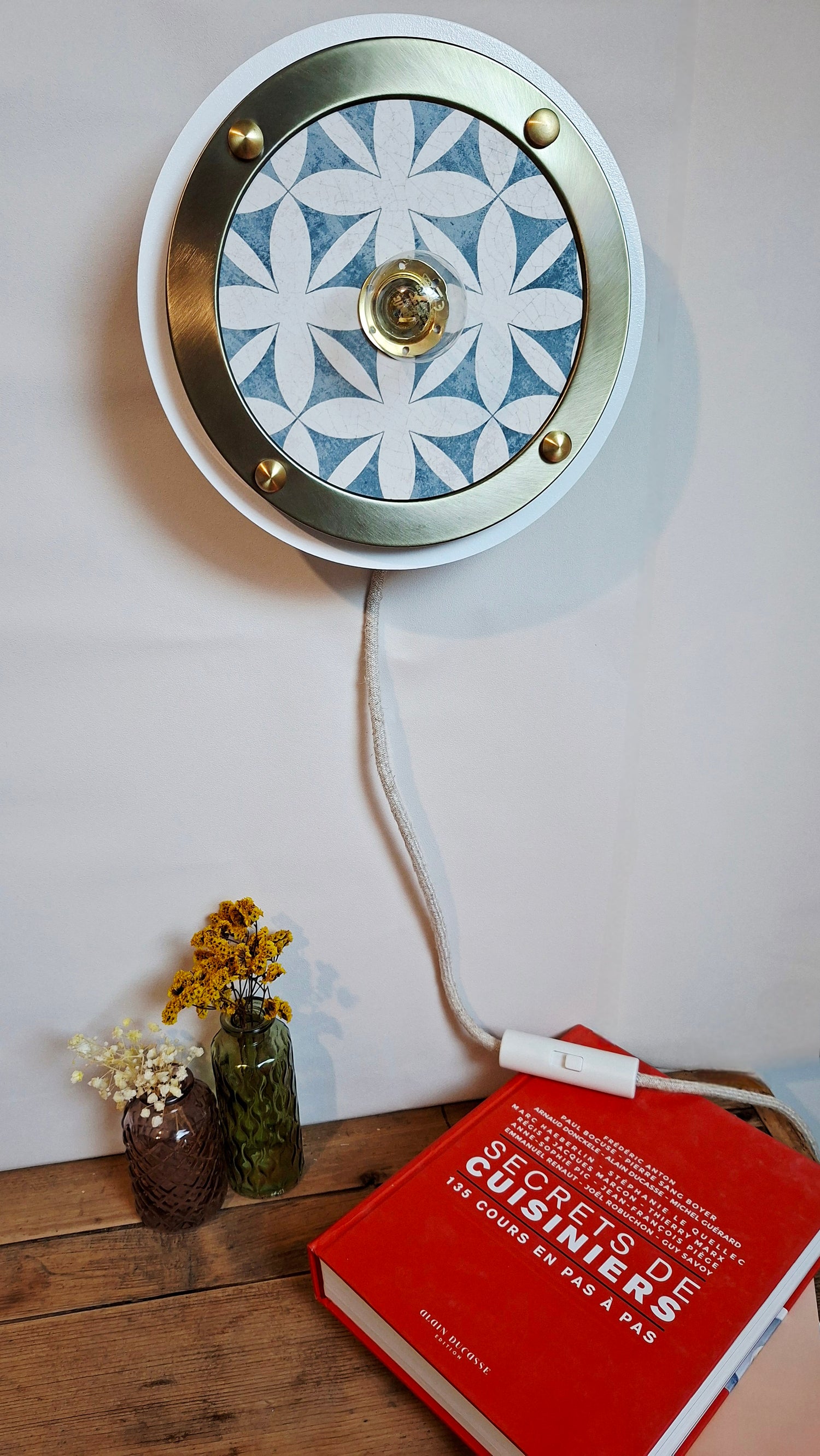 Una pieza única y elegante que combina el arte de la cerámica con el diseño moderno. Este aplique destaca por sus azulejos blancos y azules, decorados con motivos de flores de trébol, evocando tanto tradición como contemporaneidad.