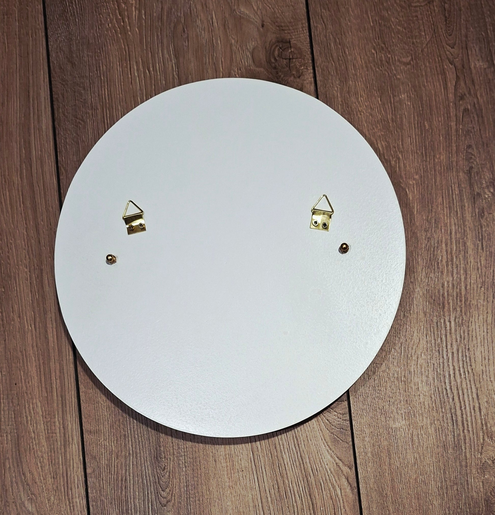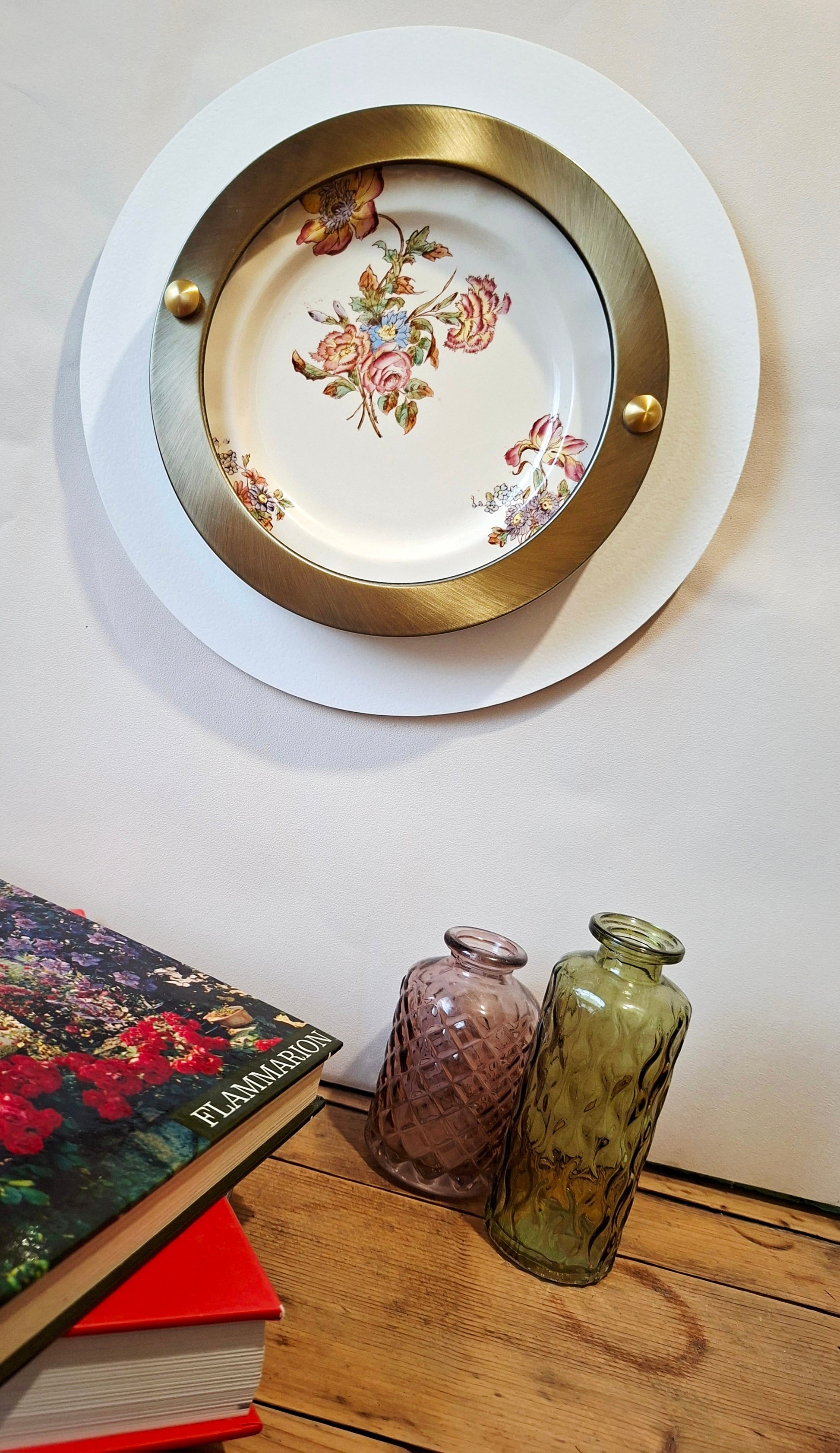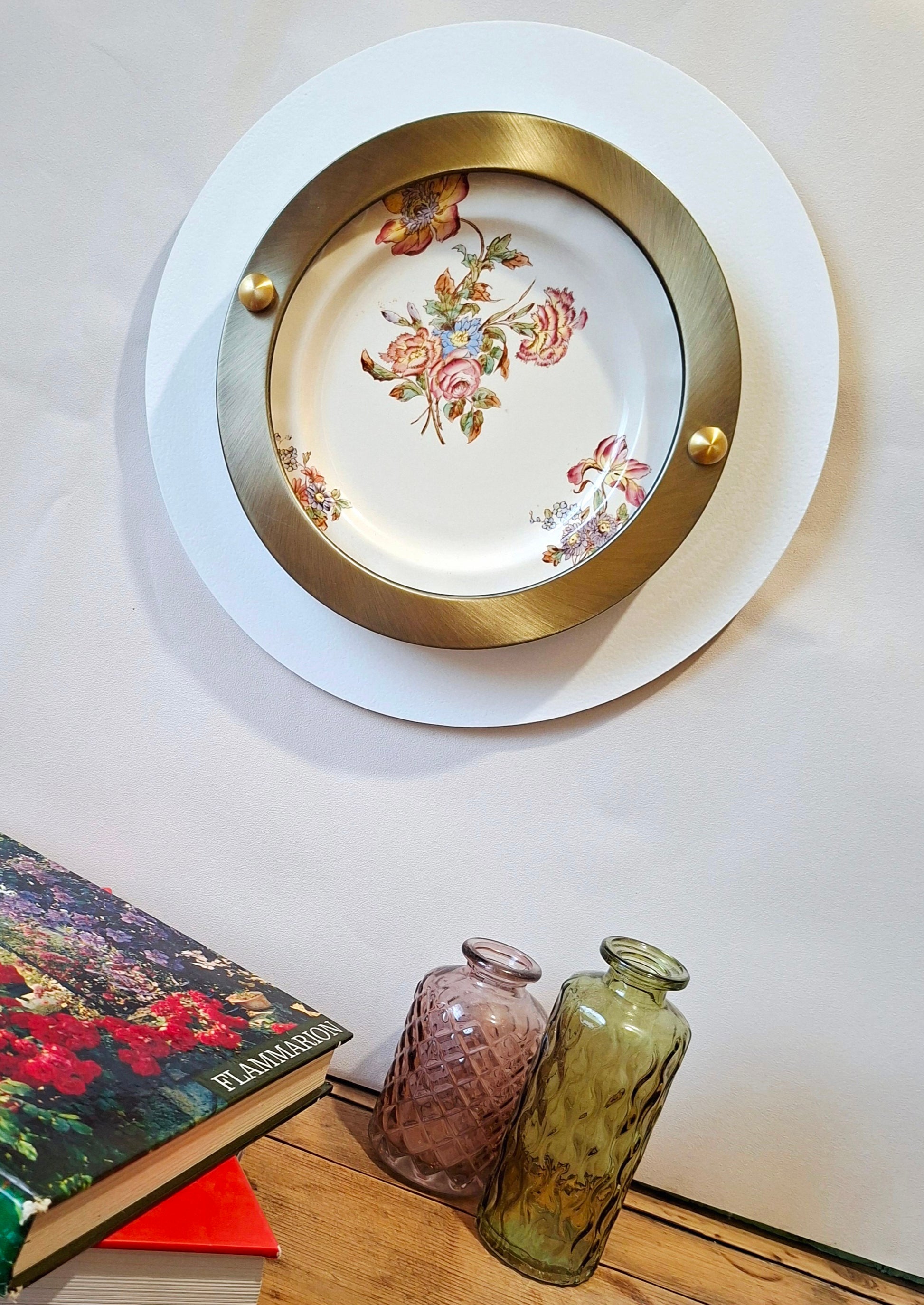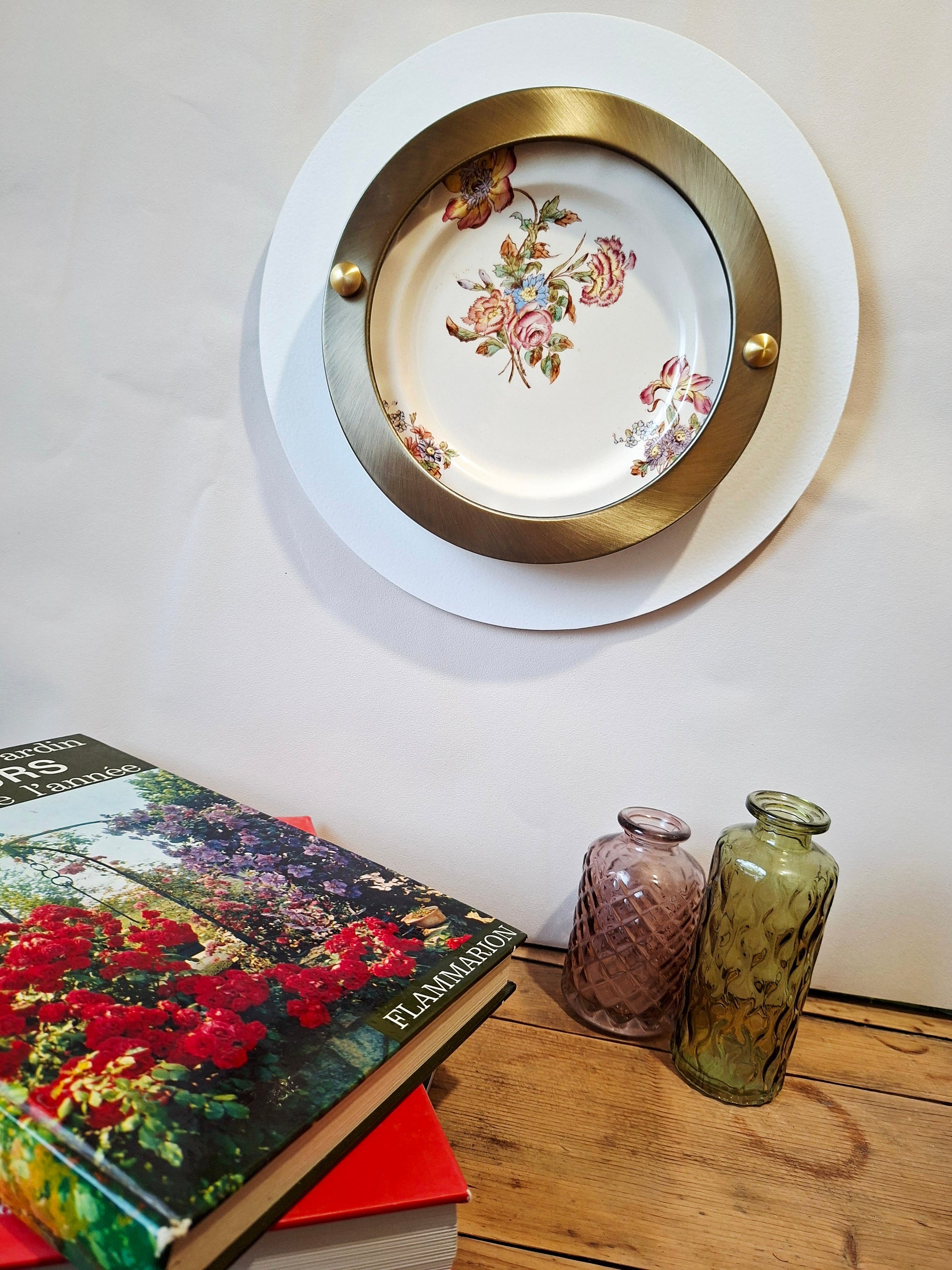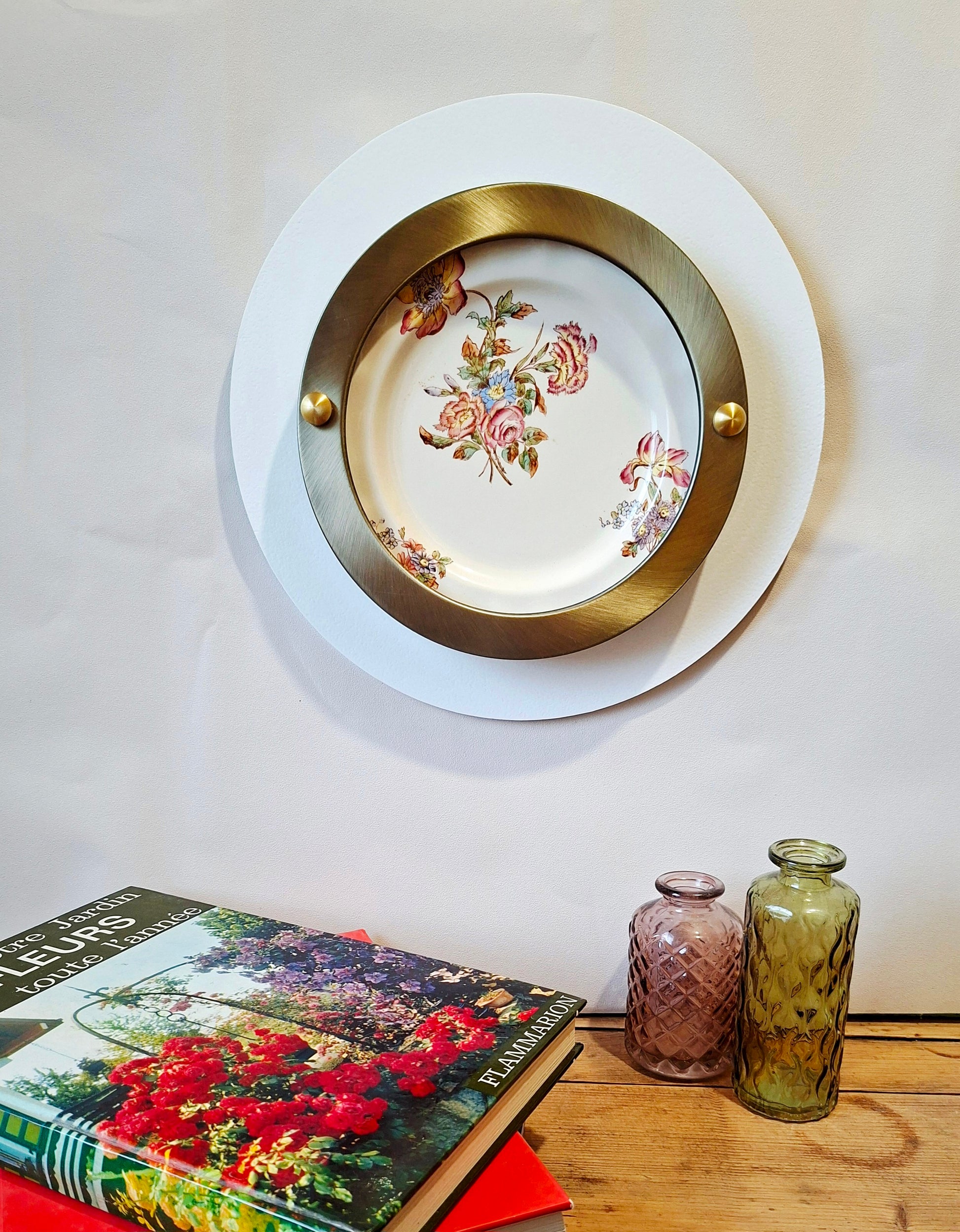 Chaque pièce est composée d’une assiette vintage soigneusement chinée, d’un cercle en bois peint à la main (30 cm de diamètre) et d’un cerclage en métal bronze délicatement posé.