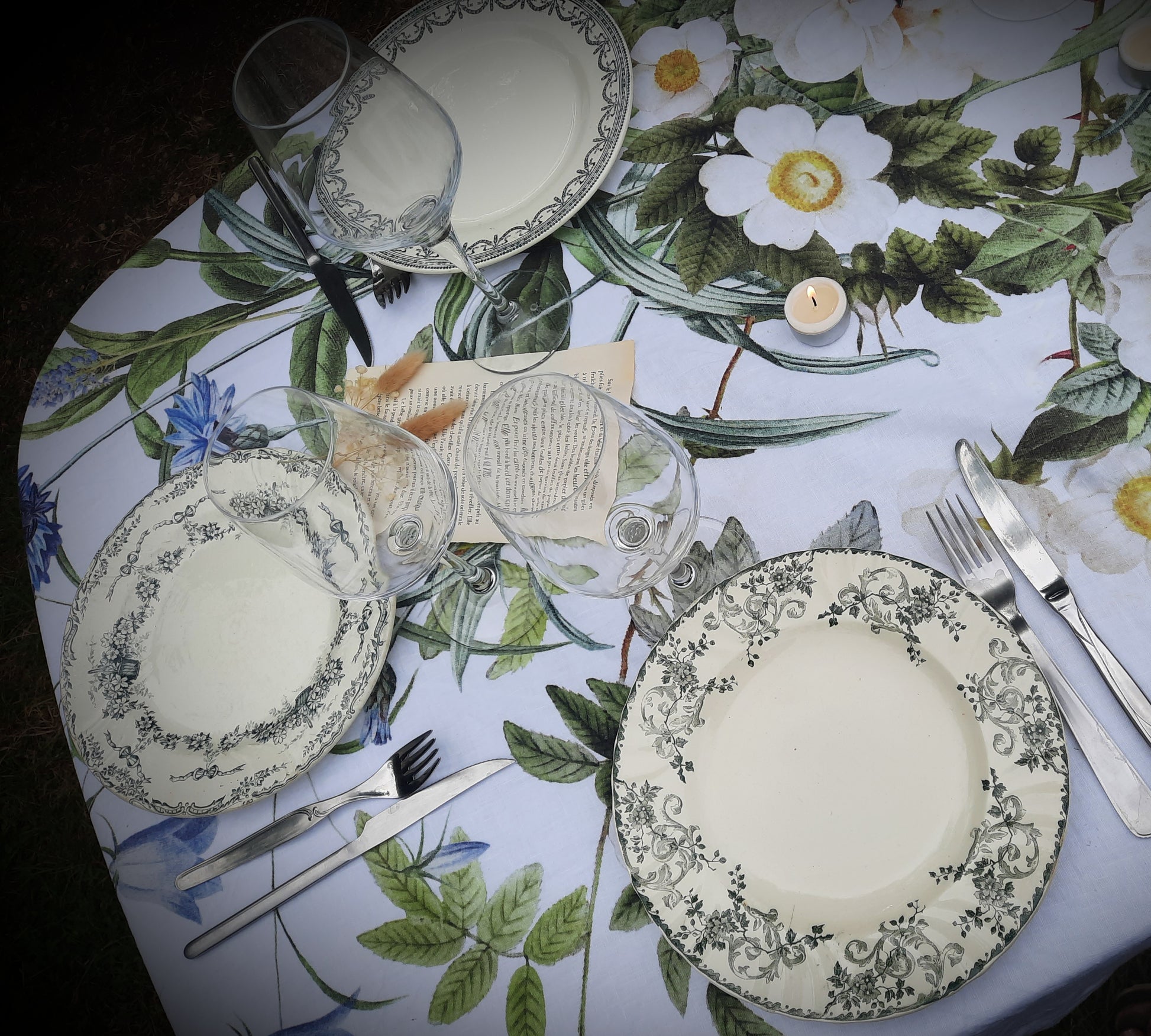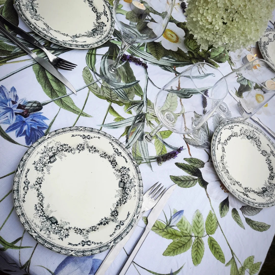 Les couleurs vert pastel se marient parfaitement avec notre nappe Jardin Bleu. Associées à de jolis verres en cristal, elles apportent fraîcheur, douceur et élégance à la table. Cette combinaison met en valeur la vaisselle ancienne tout en créant une ambiance harmonieuse et lumineuse, idéale pour une table raffinée au quotidien comme pour les grandes occasions.