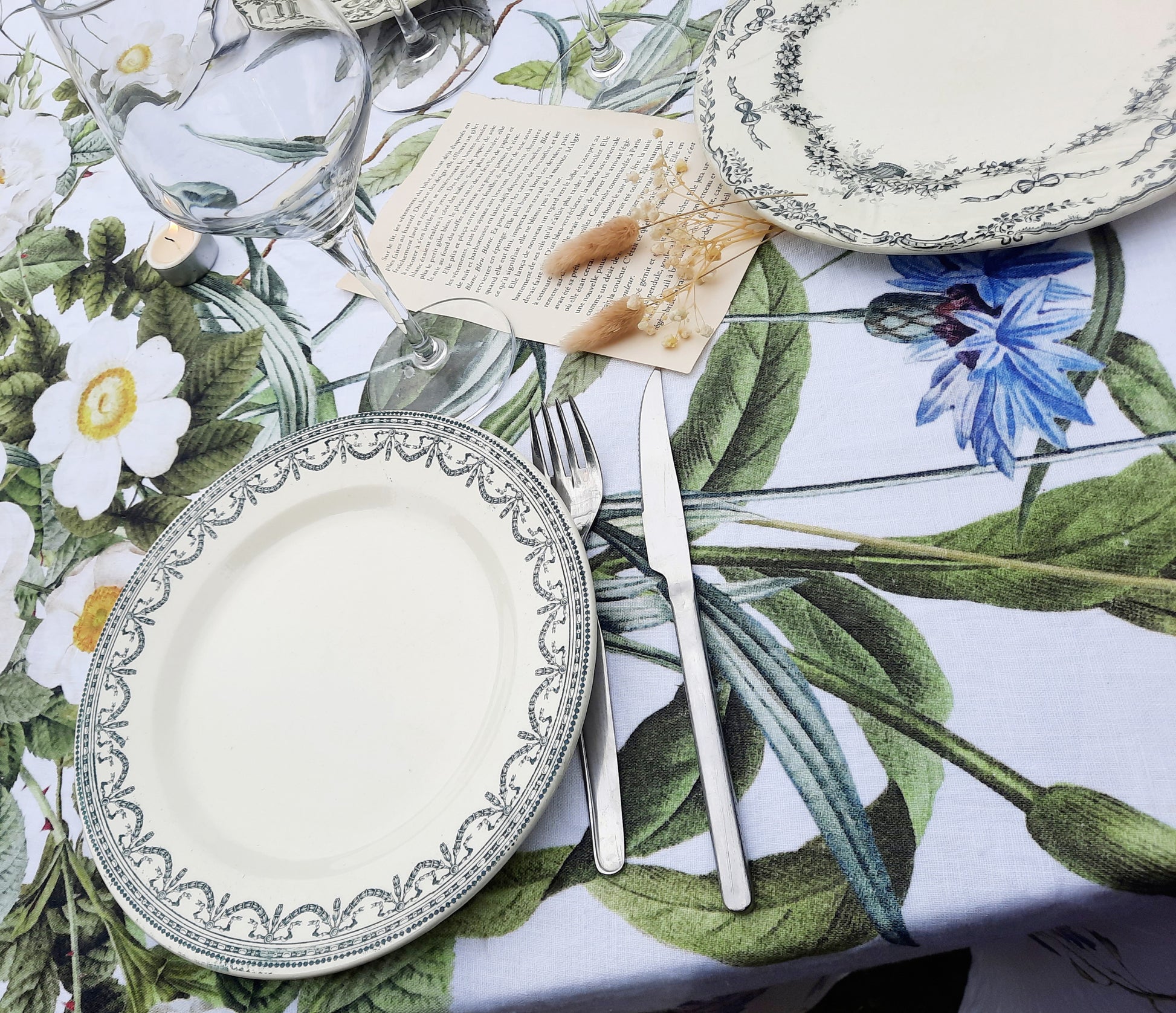 Les couleurs vert pastel se marient parfaitement avec notre nappe fleurs Jardin Bleu. Associées à de jolis verres en cristal, elles apportent fraîcheur, douceur et élégance à la table. Cette combinaison met en valeur la vaisselle ancienne tout en créant une ambiance harmonieuse et lumineuse, idéale pour une table raffinée au quotidien comme pour les grandes occasions.