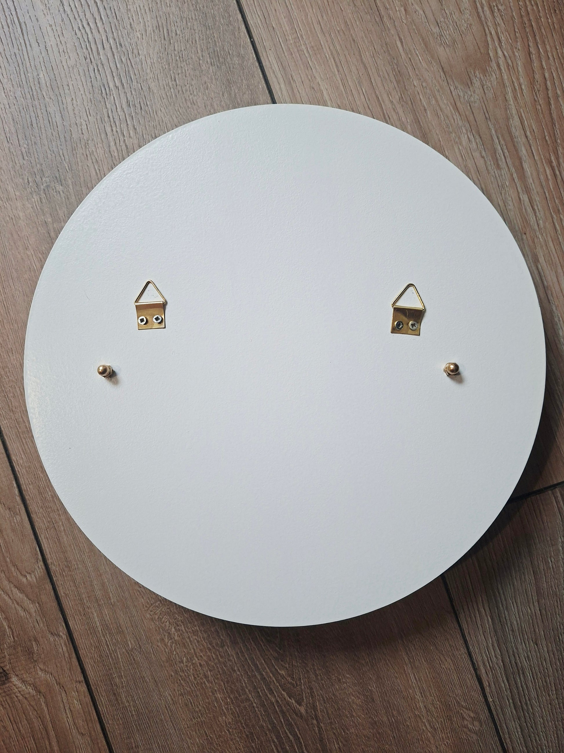 Chaque pièce est composée d’une assiette vintage soigneusement chinée, d’un cercle en bois peint à la main (30 cm de diamètre) et d’un cerclage en métal bronze délicatement posé.