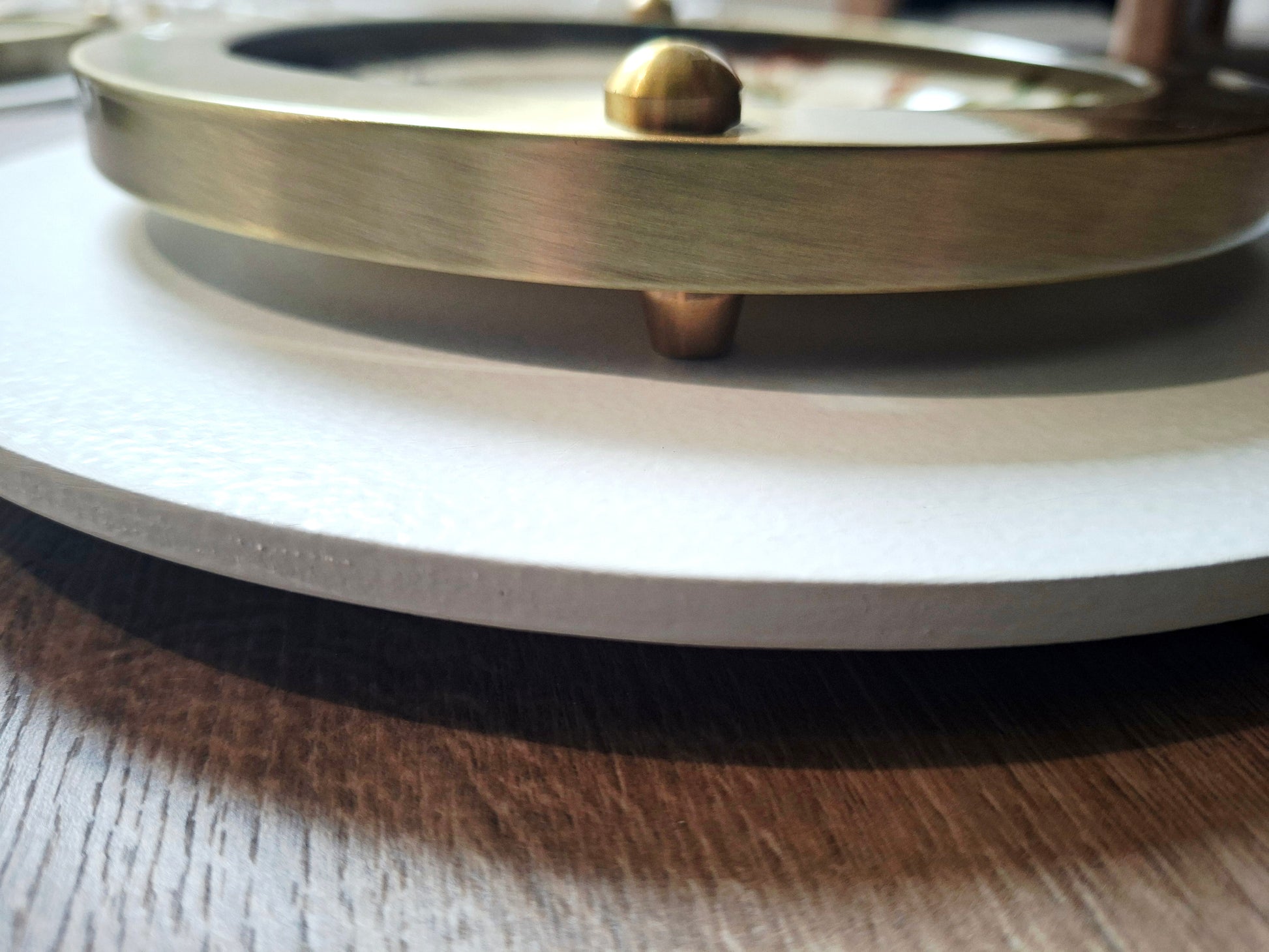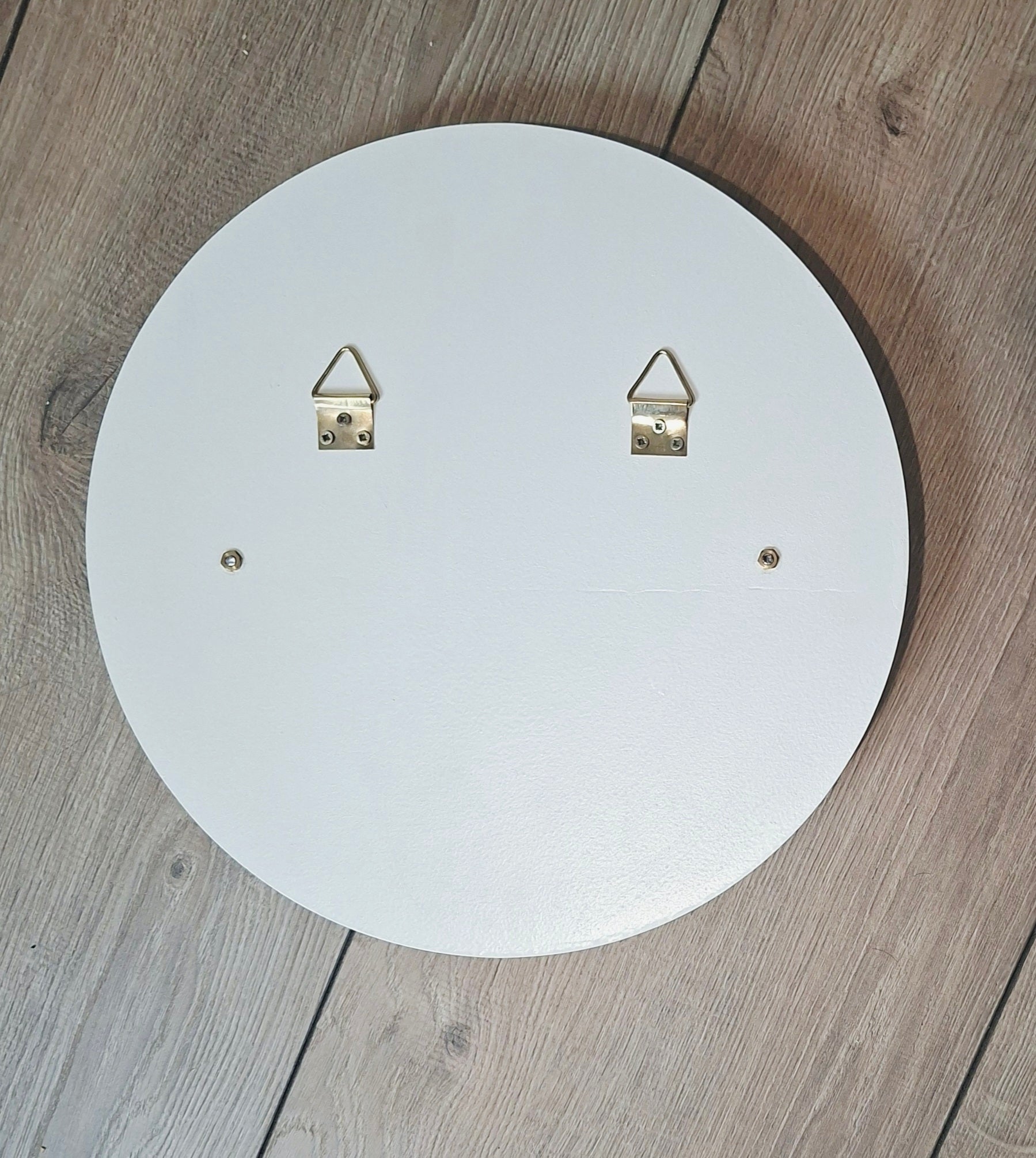 Chaque pièce est composée d’une assiette vintage soigneusement chinée, d’un cercle en bois peint à la main (30 cm de diamètre) et d’un cerclage en métal bronze délicatement posé.