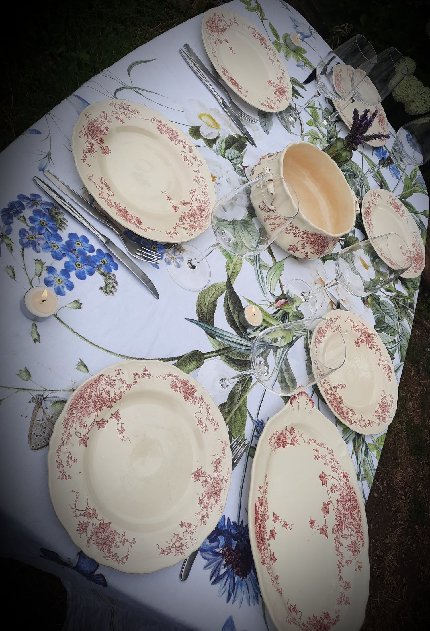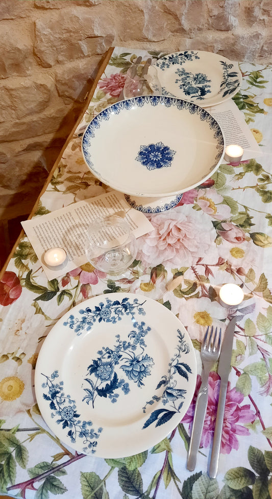 Associez le chemin de table Jardin Rose aux assiettes Ycho et au service Lunéville Rouen pour une table harmonieuse et élégante. Les tons doux du linge mettent en valeur les motifs de la vaisselle ancienne, tandis que la combinaison Ycho et Lunéville Rouen se marie à merveille pour créer un rendu à la fois raffiné et authentique. Quelques bougies et accessoires vintage complètent la table pour une ambiance chaleureuse et accueillante.