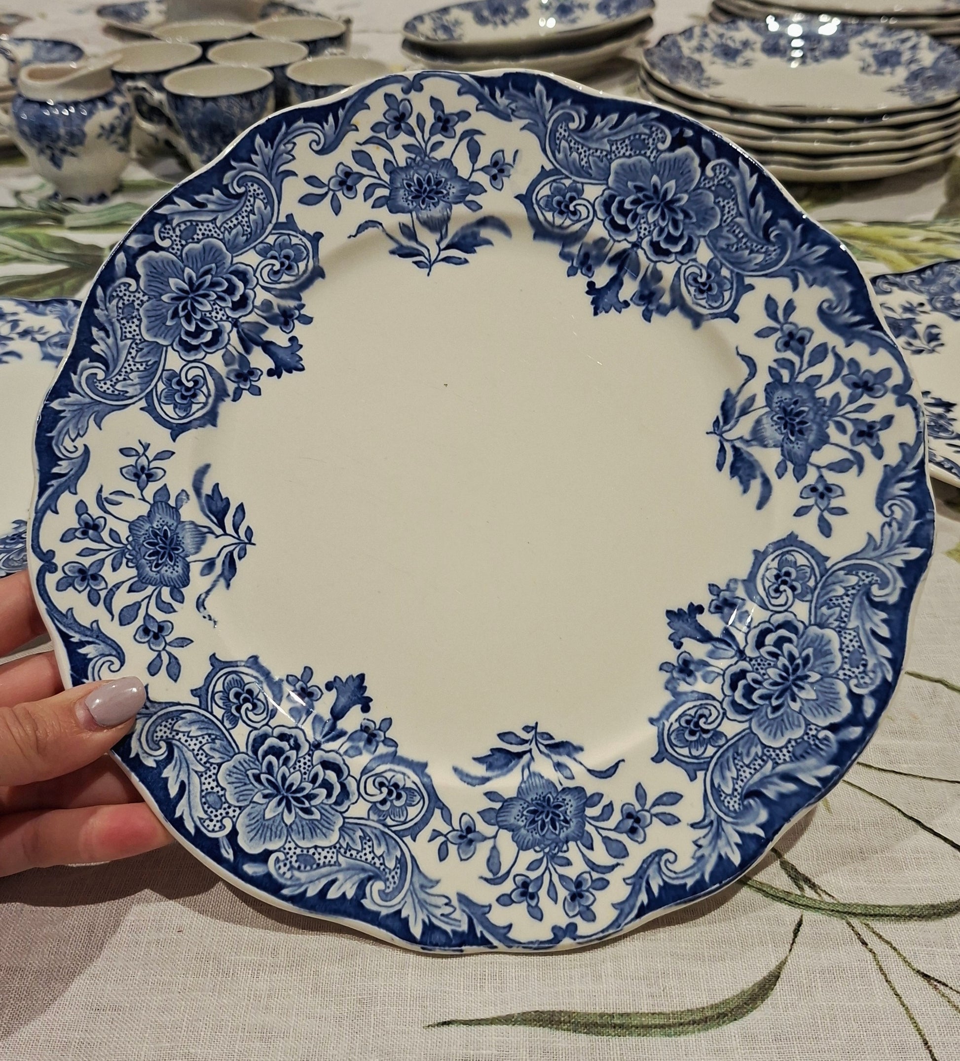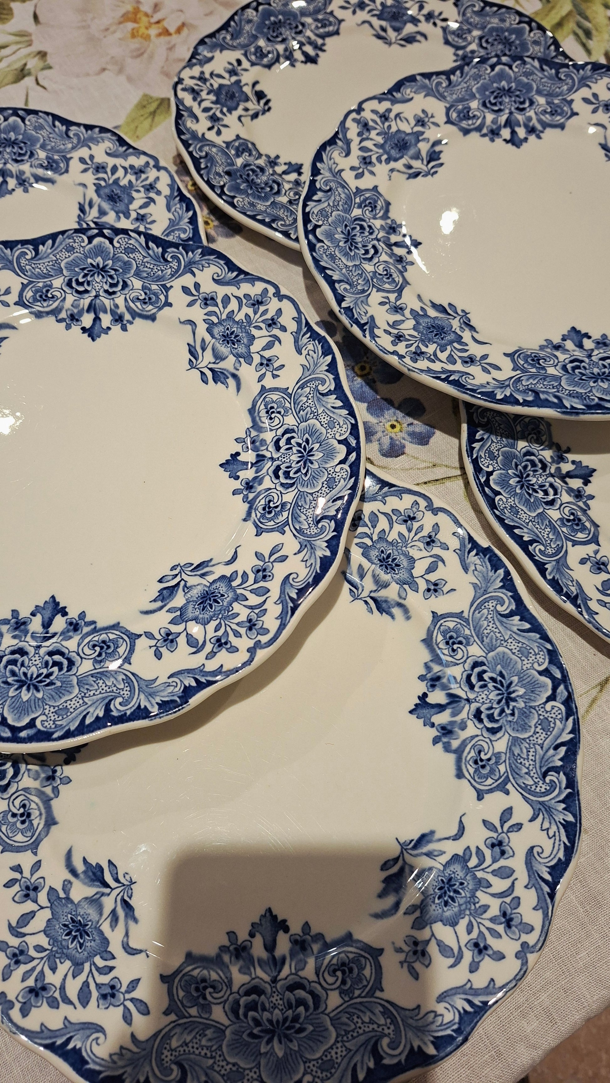 Charmant lot de 6 assiettes plates Dordrecht issu de la prestigieuse manufacture B.F.K Boch La Louvière, référence incontournable de la faïence belge au style classique et élégant.