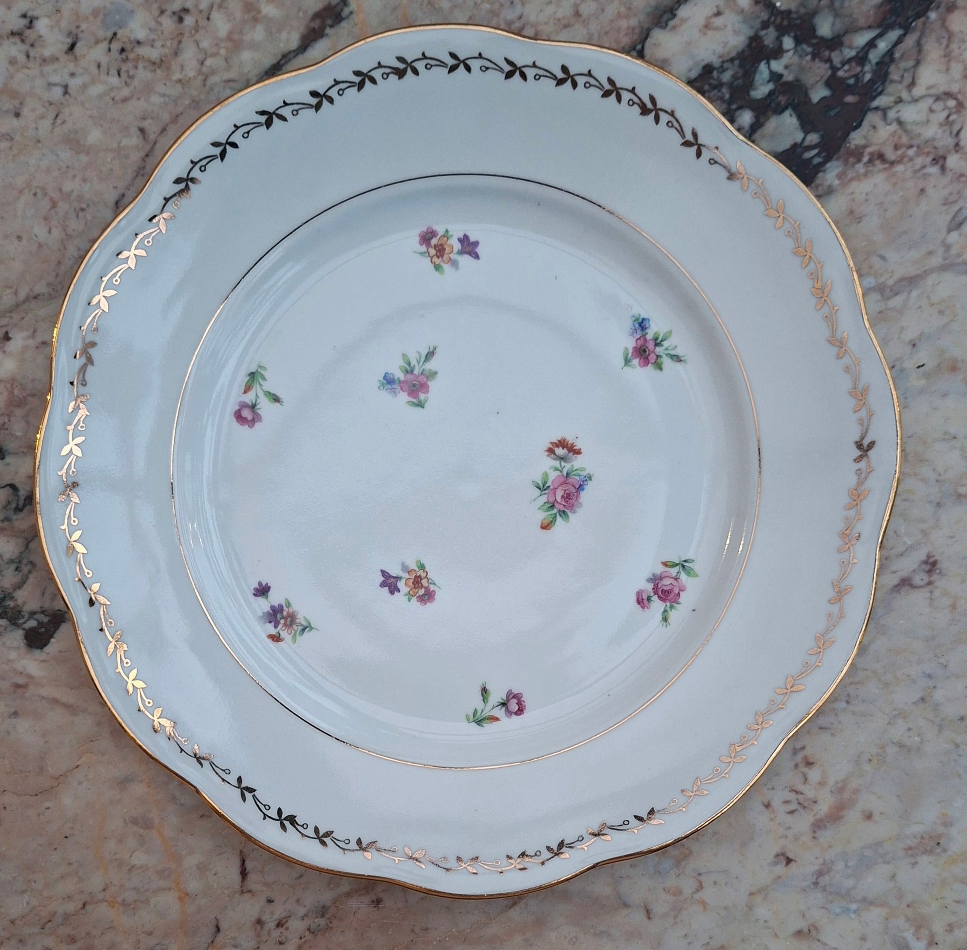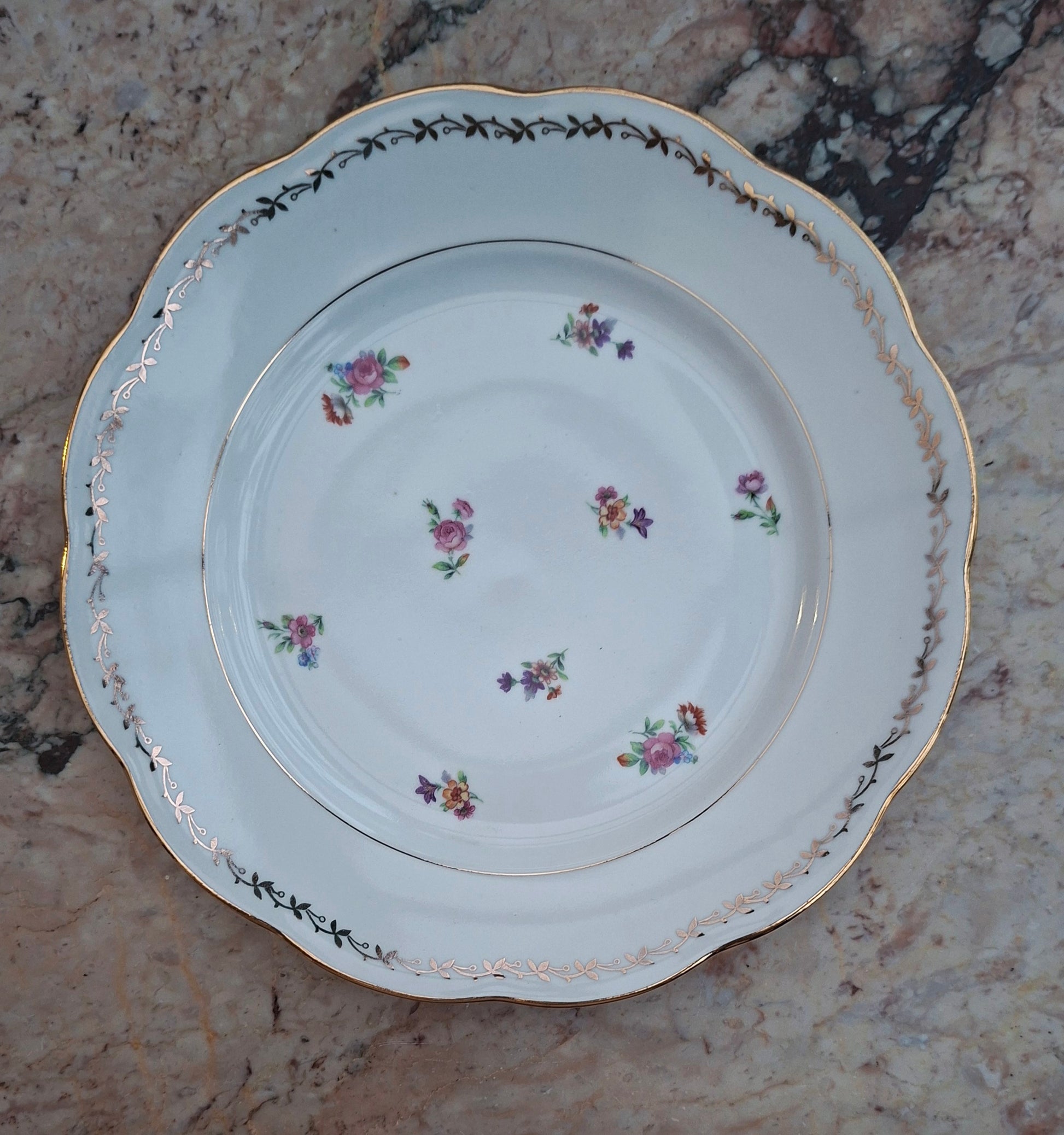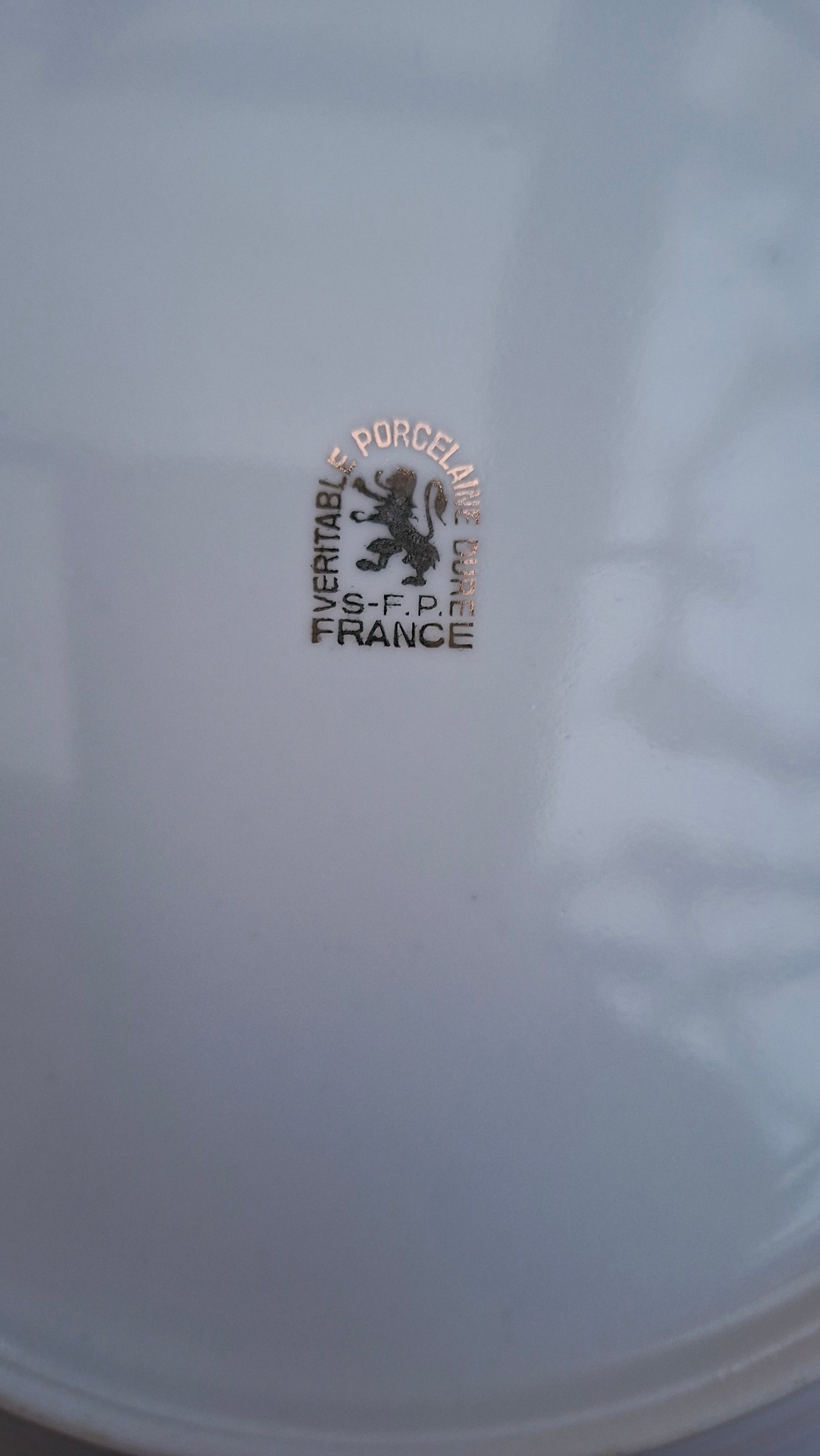 | État: | bon état général, avec quelques légers défauts d’usage : une assiette avec la fleur légèrement effacée, le filet doré très légèrement atténué à un endroit, un petit impact en dessous, presque invisible une fois posée. |