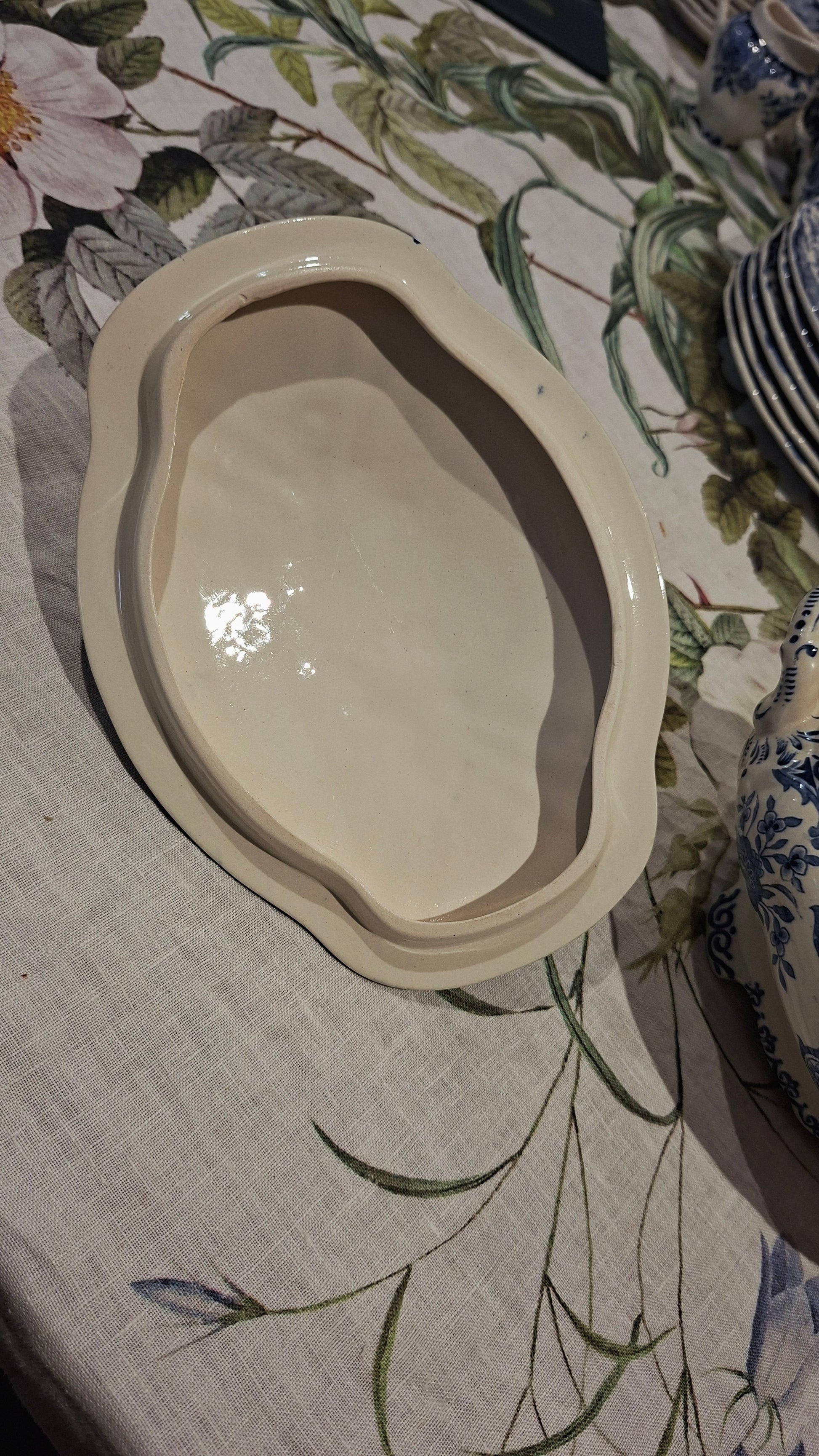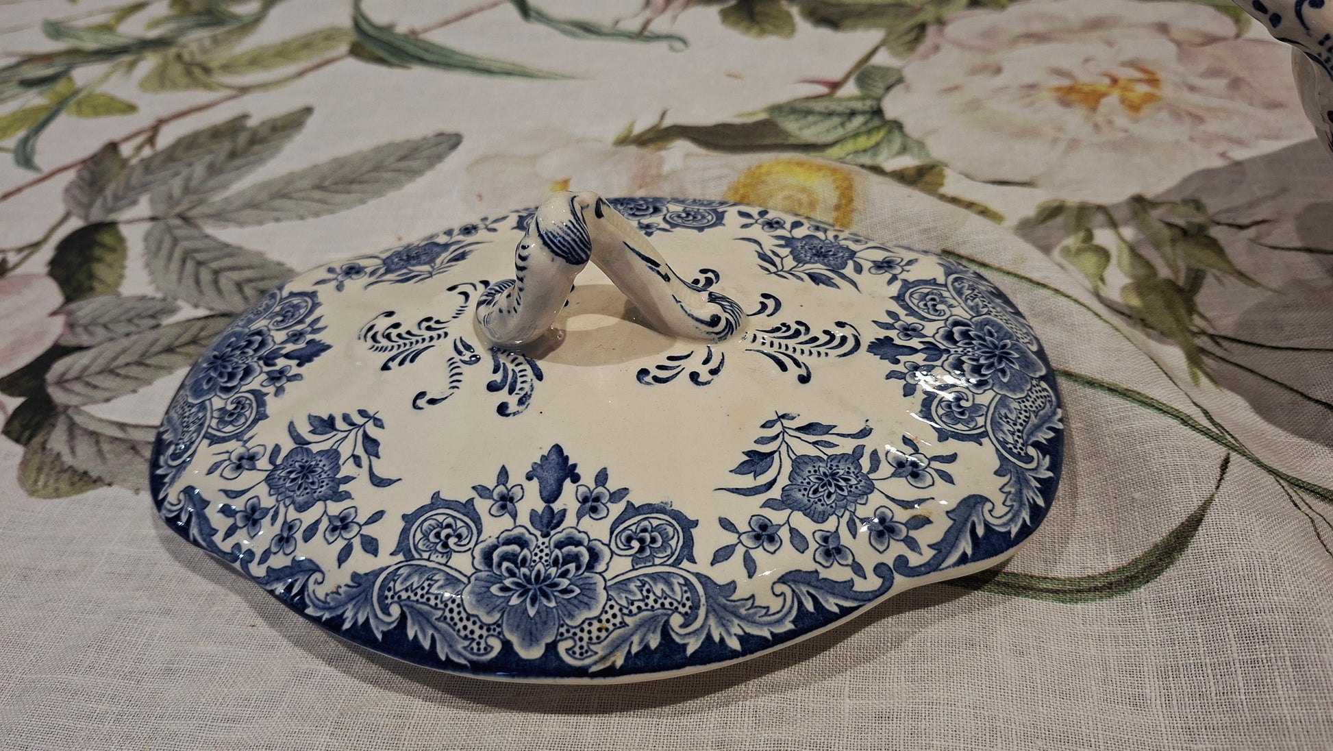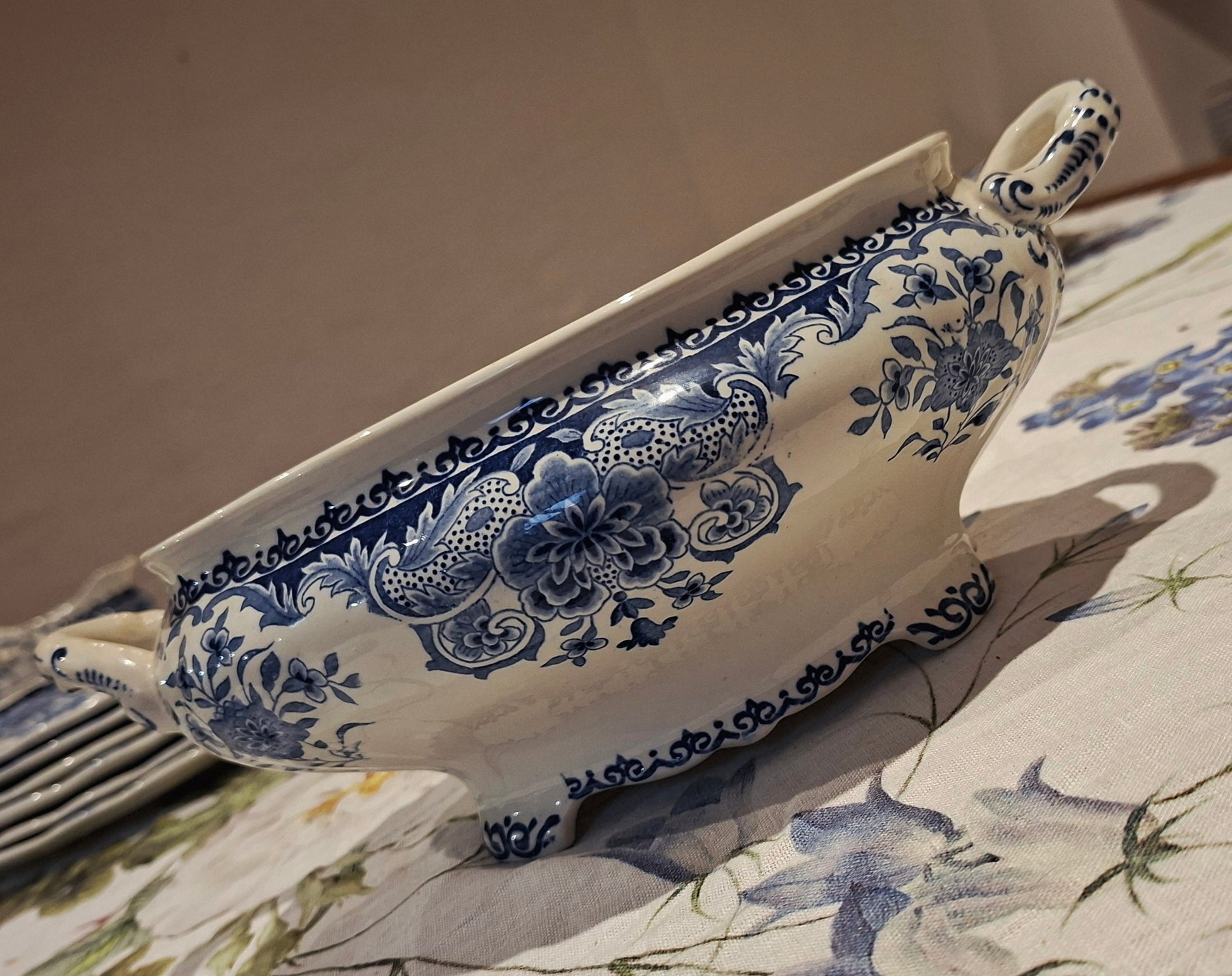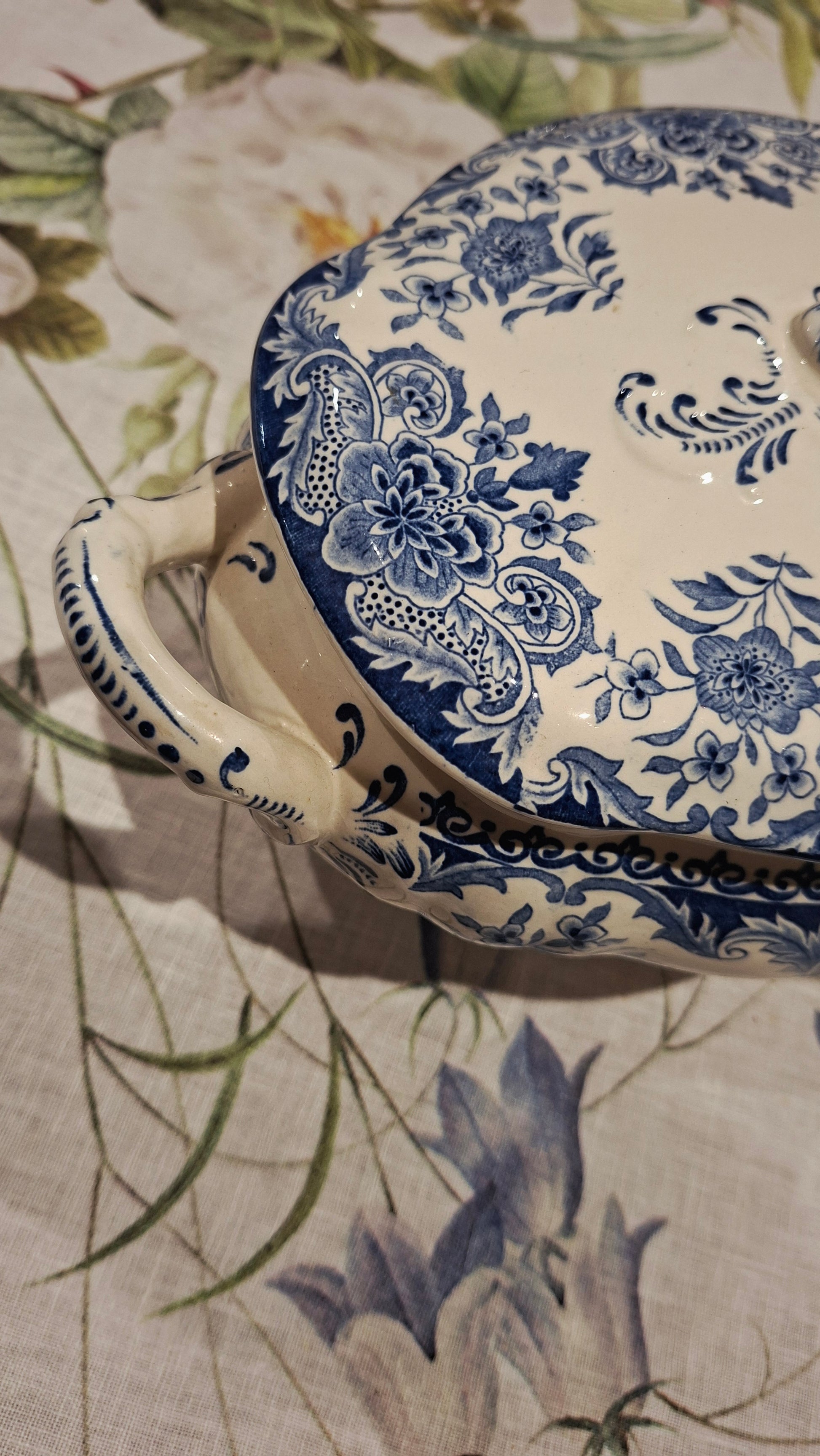 Superbe soupière Dordrecht avec poignées, issue de la prestigieuse manufacture B.F.K Boch La Louvière. Une pièce centrale au décor classique et intemporel, idéale pour compléter un service ancien de qualité.